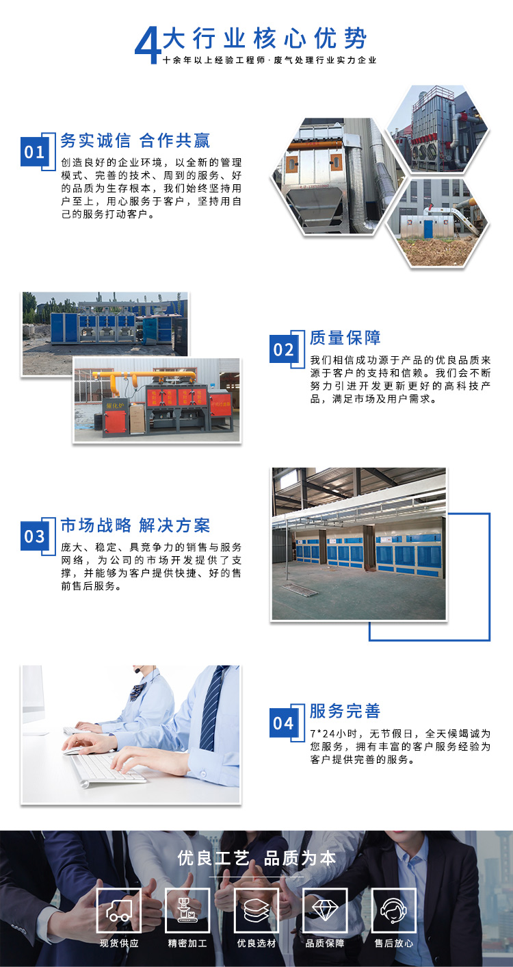 公司自成立以來,始終專注于工業(yè)廢氣、污水、粉塵等環(huán)境污染的治理,先后研發(fā)出催化燃燒設(shè)備、光氧催化廢氣處理設(shè)備、低溫等離子廢氣處理設(shè)備、粉塵處理-體化設(shè)備等一系列環(huán)保設(shè)備,產(chǎn)品先后通過ISO901質(zhì)量管理體系認證、中國環(huán)境保護產(chǎn)品認證。